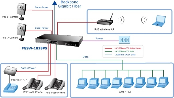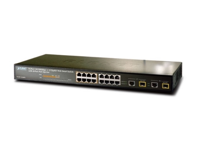 Switch cu 16 porturi, rackabil 1U cu management, 100Mbps, Auto MDI/MDIX, throughput 5.35Mpss, 8 porturi PoE IEEE802.3af (15.4W), 2 porturi Gigabit combo TP/SFP, alimentare 220VAC/1A