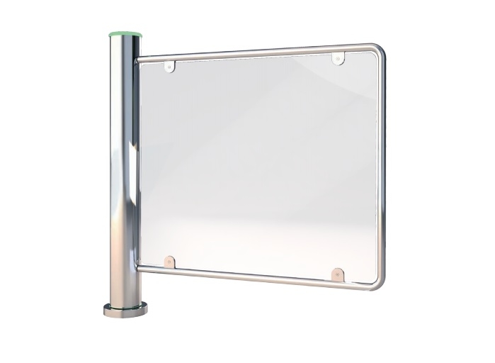 Poarta cu sticla pentru cai de acces cu spatii limitate (ex. magazine), dar acces generos pentru cosuri de cumparaturi etc., cu rotatie de 180 grade a foii-usa, circulatie dublu sens, controler inclus