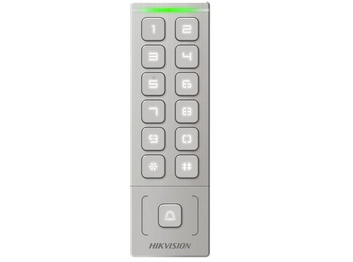 Cititor de carduri M1 cu tastatura (butoane fizice), 1 interfata Wiegand (W26/W34), 1 iesire alarma, 1 intrare contact usa, 1 buton exit, 1 interfata control yala, capacitate 1000 utilizatori si 1000 carduri, distanta citire carduri 3 cm, durata citire carduri 1 s, de exterior - IP65, alimentare 12VDC, 1A, dimensiuni 151 x 48 x 21.5 mm