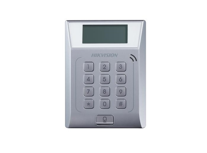 Cititor de proximitate standalone pentru carduri EM cu tastatura si sonerie, autentificare pe baza de card / card si parola, max. 3,000 carduri, max. 10,000 evenimente inregistrate, comunicare TCP/IP, procesor 32 biti, 13 taste (0-9, *, #, sonerie), ecran STN cu rezolutie 128x64 pentru afisarea orei, datei si saptamanii, indicator LED pentru comunicare/status, beeper, tensiune alimentare 12 VDC, temperatura / umiditate operare -20°C ~ +65°C / 10-90% RH, dimensiuni 126.5(L) x 94.5(W) x 24(H)mm