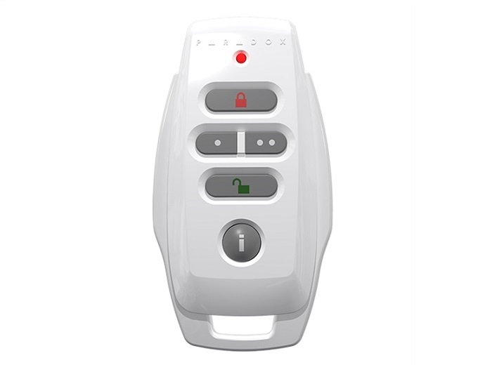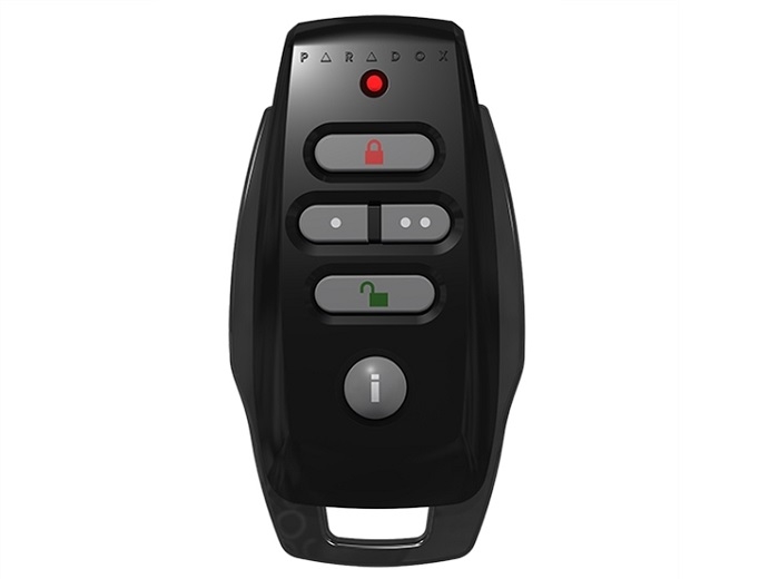 - Afisare status la apasarea butonului de informare (i). Telecomanda va initia comunicarea cu sistemul Paradox si va afisa statusul acestuia: Armat (Rosu), Dezarmat (Verde), Alarma sau Alarma in memorie (lumina rosie care palpaie).