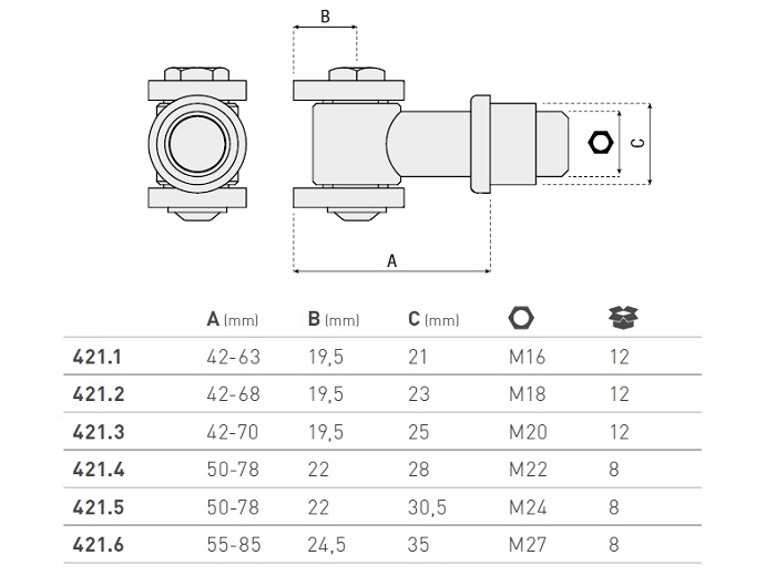 Balama superioara cu placi pentru a fi sudate, M16, dimensiuni 42-63 x 19.5 x 21 mm