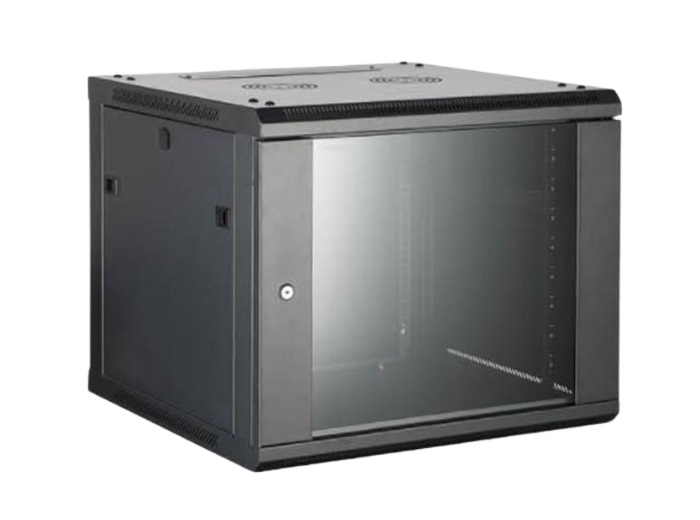 Rack 19 inch, 9U, montare pe perete, capacitate incarcare statica 40kg, dimensiuni 600 * 450 * 500 mm, greutate neta 18.7 kg, material SPCC, usa in partea din fata - 4 mm sticla, 1 mm SPCC, deschidere usa in procent de 78%