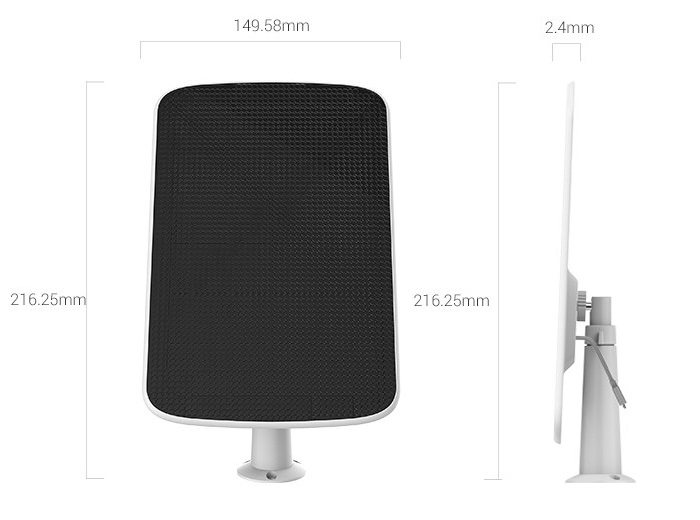 Panou solar, model E, conceput pentru camere EZVIZ cu alimentare pe baterie si porturi de incarcare Type-C, tensiune alimentare 6V ± 5%, curent alimentare max. 1030 mA ± 5%, alimentare max. 6.18 W, eficienta tranformare 21.6%, temperatura si umiditate operare -20°C - 60°C, 90% RH, grad protectie IP65, dimensiuni 283.7 x 185.7 x 2.4 mm, greutate 484g