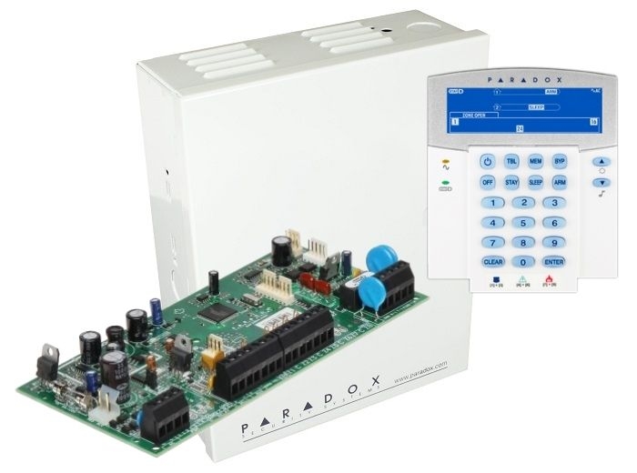Centrala PARADOX SPECTRA SP5500 + Cutie metalica AWO 000EI cu transformator + tastatura cablata LCD K35 cu pictograme si 32 zone. SP5500: 5 intrari de zona sau 10 cu ATZ, extensibila la 32 zone, extensibila la 16 iesiri PGM (2 pe placa), suporta 15 tastaturi/module, 2 partitii, 32 coduri utilizator, memorie 256 evenimente