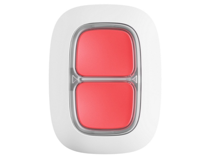 Buton dublu de panica wireless, adresabil, hold-up, cu protectie ridicata impotriva apasarilor accidentale (ambele butoane trebuie apasate simultan pentru alarma), culoare alba, LED care indica transmiterea alertei, distanta semnal radio max. 1300 m, alimentare cu 1 baterie CR2032, 3 V, IP55, dimensiuni 47 x 35 x 16 mm, greutate 17g