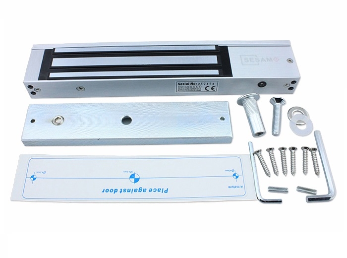 Electromagnet forta 280 kg, cu LED rosu si monitorizare (NC-COM-NO), fail-safe (power to lock), pentru o usa din lemn, sticla, metal etc., montaj aplicat, consum curent redus, operare durabila si silentioasa, alimentare 12 VDC, curent absorbit 12V/380mA, dimensiuni 250 x 25 x 47 mm, dimensiuni armatura 130 x 38 x 11 mm, greutate aprox. 1.8 kg