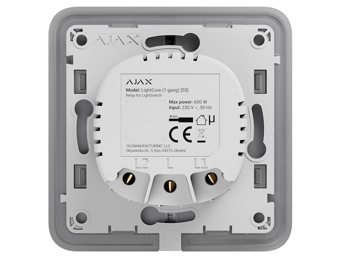 Releu LightCore 1-gang, dimensiuni 76.3 x 72.3 x 29.2 mm, greutate 45.95g. Impreuna cu butonul SoloButton 1-gang/2-way formeaza intrerupatorul LightSwitch 1-gang care activeaza un dispozitiv prin apasare sau apropierea mainii la maxim 15 mm. Compatibil cu Hub Plus, Hub 2 (2G/4G), Hub 2 Plus, Hub Hybrid (2G/4G), Rex si Rex 2.