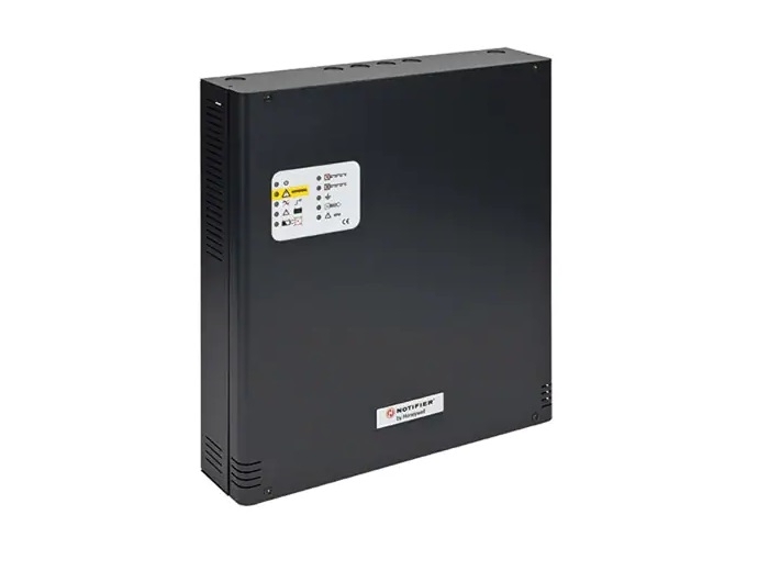 Sursa auxiliara de alimentare EN 54-4, 24 VDC, 5 amp, iesire 24V single sau twin, tensiune intrare 115-230 VAC 50/60 Hz, LED-uri locale pentru gasirea rapida a defectelor, intrari cabluri in partea de sus sau din spate, capacitate cablu 2.5 mm CSA, protectie impotriva scurtcircuitelor si supraincarcarii, carcasa din otel care ofera spatiu pentru 2 acumulatori de 17 Ah, dimensiuni carcasa 377 x 408 x 92 mm, protectie IP 30
