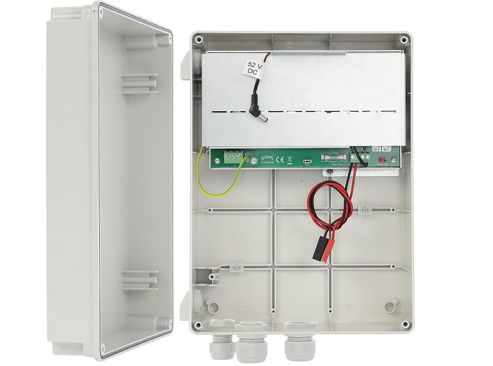 Sursa backup pentru sisteme PoE, 52V/60W, suporta backup acumulator 7Ah, clasa protectie EN 62368-1: I (prima), grad protectie EN 60529: IP44, protectie impotriva scurt-circuitarii (SCP), supraincarcarii (OLP), supratensiunii (OVP), descarcarii electrice (UVP), intrare Φ0,63-2,50 (AWG 22-10), iesire alimentare PoE DC 2,1/5,5 plug, iesire BAT - cabluri baterie 6,3F-45cm, glande cabluri si diametru cabluri 1 x Φ=10÷14mm, 2 x Φ=13÷18mm, inaltime glanda cabluri 37mm (+/-2mm), dimensiuni carcasa ABS 240 x 308 x 130 (+/-2mm)