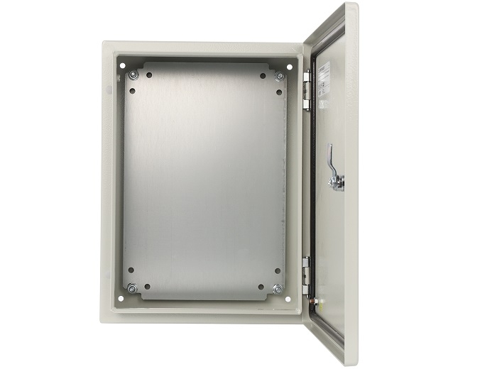 Carcasa metalica ermetica cu placa montaj, protectie IP66, utilizare in exterior, protectie anticoroziune, culoare gri, dimensiuni exterioare W=300, H=400, D=150 (+/-2mm), metal carcasa de grosime 1.2mm, placa montaj de 1.5mm, usa interschimbabila - dreapta sau stanga, temperatura operare -10C ÷ +40°C, umiditate 20% - 90% fara condens