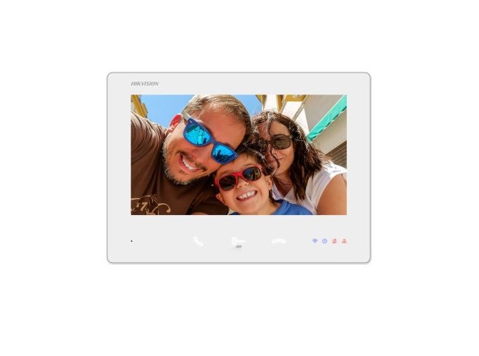 Post de interior alb, touchscreen cu diagonala 7", rezolutie 1024 x 600, 1 microfon omnidirectional si 1 difuzor incorporate, capacitate evenimente - 200 imagini capturate (cu card TF, max. 128GB), protocol comunicare TCP/IP, RTSP, standard Wi-Fi 2.4GHz, IEEE802.11b/g/n, 1 intrare alarma, 3 butoane touch (raspuns, descuiere si inchidere apel) + 1 buton fizic (reset), 4 indicatoare, dimensiuni 190.2 x 138.2 x 20 mm, alimentare 48V, prin DS-KAD7060EY sau DS-KAD7061EY