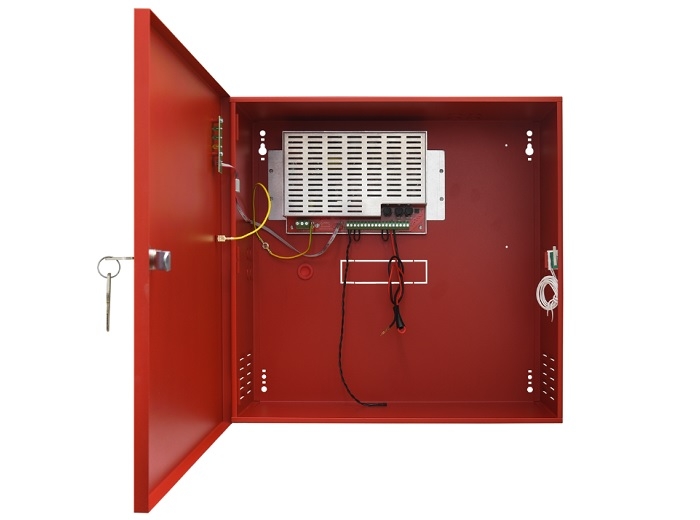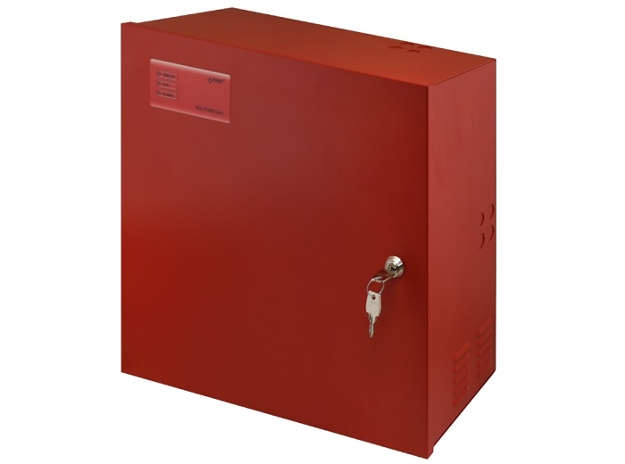 Sursa pentru sisteme de incendiu EN54C, 27.6V/5A, suporta backup acumulator 2 x 40Ah, in conformitate cu standardele EN 54-4 si EN 12101-10, 2 iesiri protejate independent AUX1 si AUX2, protectie impotriva scurt-circuitarii (SCP), supraincarcarii (OLP), supratensiunii (OVP), descarcarii electrice (UVP) si sabotajului - tamper, indicator LED, test baterie automat, proces de incarcare baterie in 2 etape, incarcare baterie accelerata, monitorizare continuitate circuit baterie, tensiune baterie, incarcare si mentenanta baterie, dimensiuni carcasa metalica rosie 425 x 411 x 178 mm