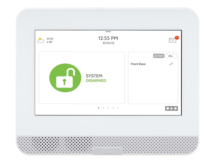 Centrala de alarma IQ 4 HUB, touchscreen LCD de 7" rezolutie 1024 x 600 px, comunicare 4 LTE & WiFi (802.11 a/b/g/n/ac, 2.4/5GHz), Z-Wave Plus (800) - pana la 137 dispozitive, PowerG - pana la 128 dispozitive, dezarmare prin Bluetooth, streaming muzica, 1 microfon, 1 difuzor frontal 4W, sirena 85dB, 128 zone, 4 partitii, pana la 242 coduri utilizatori, sistem de operare Android 9, integrare PowerManage si ConnectAlarm, certificare EN50131 gradul 2, dimensiuni 155 x 191 x 26 mm